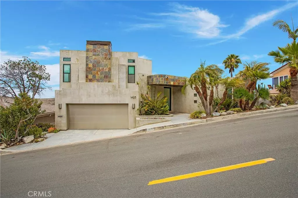 This charming contemporary home, designed by architect James Conrad, is set high on Skyline Drive and offers expansive views ocean, canyon, hill and city light views. Once inside this light and bright home, you find an elevated family room where you can enjoy sweeping views from the large picture windows. Down the hallway is the main floor master bedroom suite which is complete with a step-in shower, deep jacuzzi-style tub, linen closet with skylight, walk-in closet and direct access to one of several view decks. For entertaining, the kitchen offers stainless steel appliances, featuring a six-burner gas range-top, double ovens and a built-in refrigerator. From the kitchen and dining room, you will have direct access to a large wraparound balcony where you can enjoy the views and evening sunsets. Downstairs you will find 3 additional bedrooms, one of which has direct-access to an ocean view deck. This 4th bedroom does not have a closet and could be used as an office or workout room. Minutes away you will find world class dining, unique shops, famous summertime festivals, including the Sawdust Festival and the Pageant of the Masters, as well as hiking/biking trails.